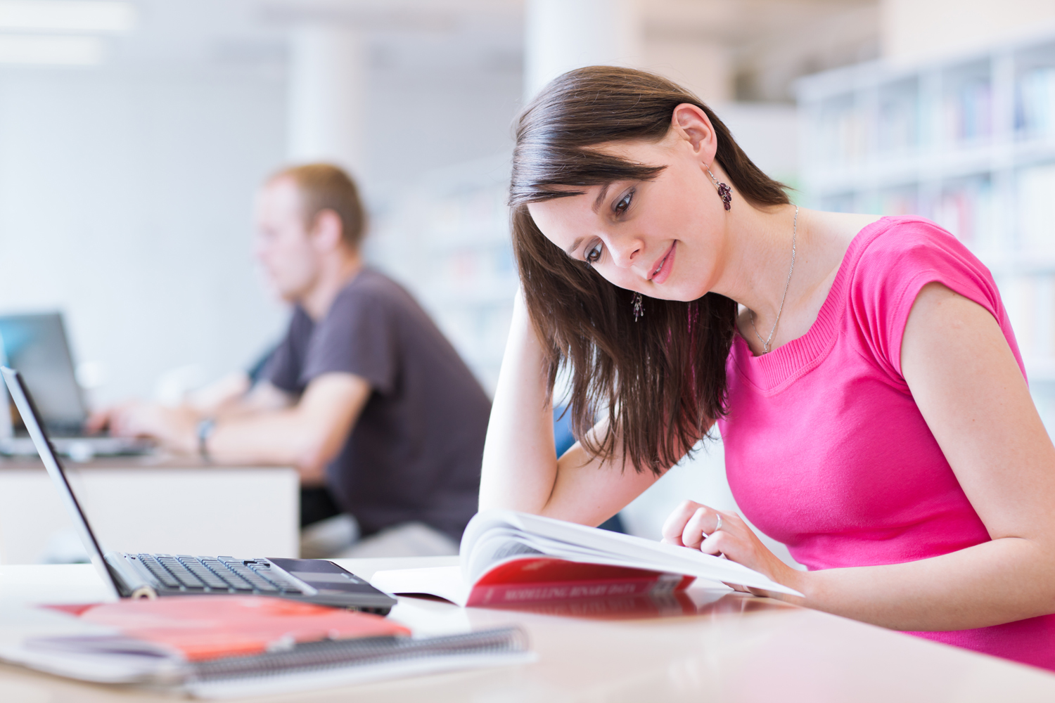 In the library – pretty female student with laptop and books working in a high school library (color toned image)